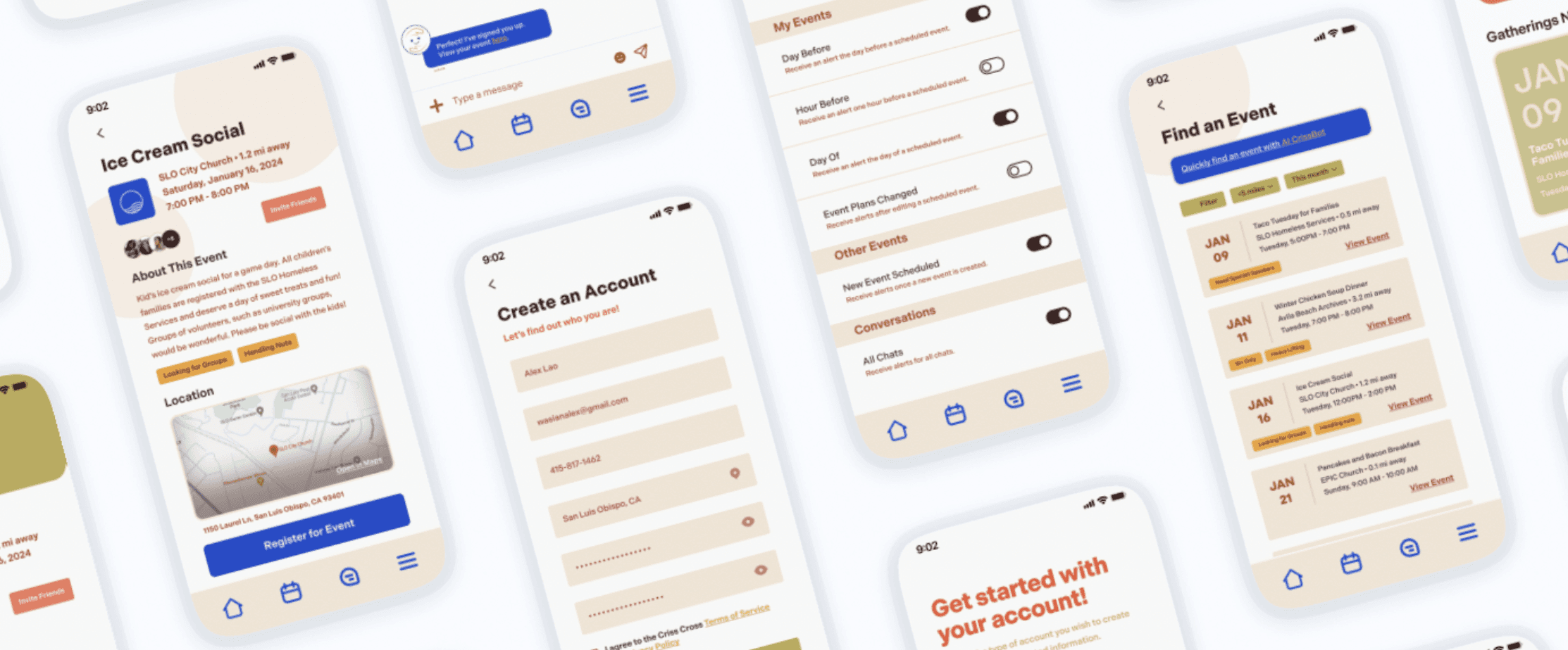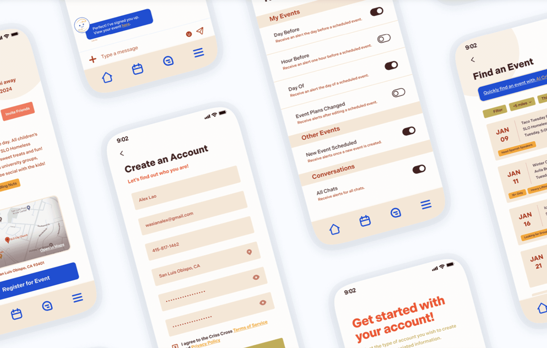 In January of 2024, I competed in UXFest SLO, a 24 hour designathon. This year's challenge was to create a working web or mobile prototype that aims to address food insecurity, health & dietary concerns, and/or culinary exploration. In addition, our app/website had to include an AI driven feature. After a long 24 hours of brainstorming, collaborating, researching, designing, and prototyping, we introduce to you CrissCross: A mobile application that connects volunteers and organizations to host events that target food insecurity. Collaborating with my incredible team members, Jessica Mason, Sophia Koruga, Keilana Calder, and Claire Ogawa was a highlight of this experience. And we worked well together, as our team placed 2nd in the competition among 22+ groups!